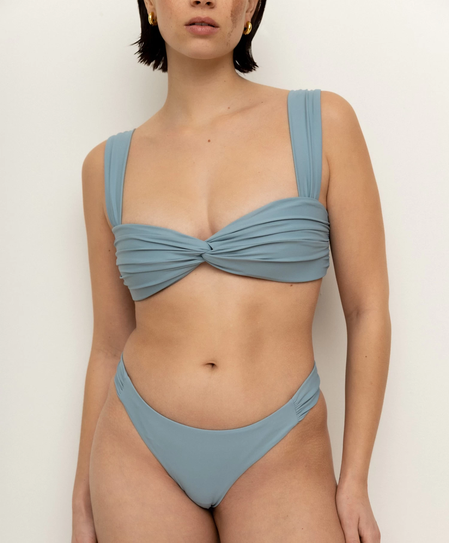 Zoals alles binnen de collectie van VIVEH, is ook de vergrijsd blauwe Azotic bikinitop ontworpen om je curves te omarmen – in dit geval vrij letterlijk. Het ontwerp met voorgevormde cups voorzien van een getwist detail, rimpelplooien langs de zijkant en zelf-te-strikken sluiting is allesbehalve standaard. De extra-brede schouderbandjes zijn niet alleen een bepalend onderdeel voor de stijlvolle look, ze zorgen ook voor voldoende ondersteuning.