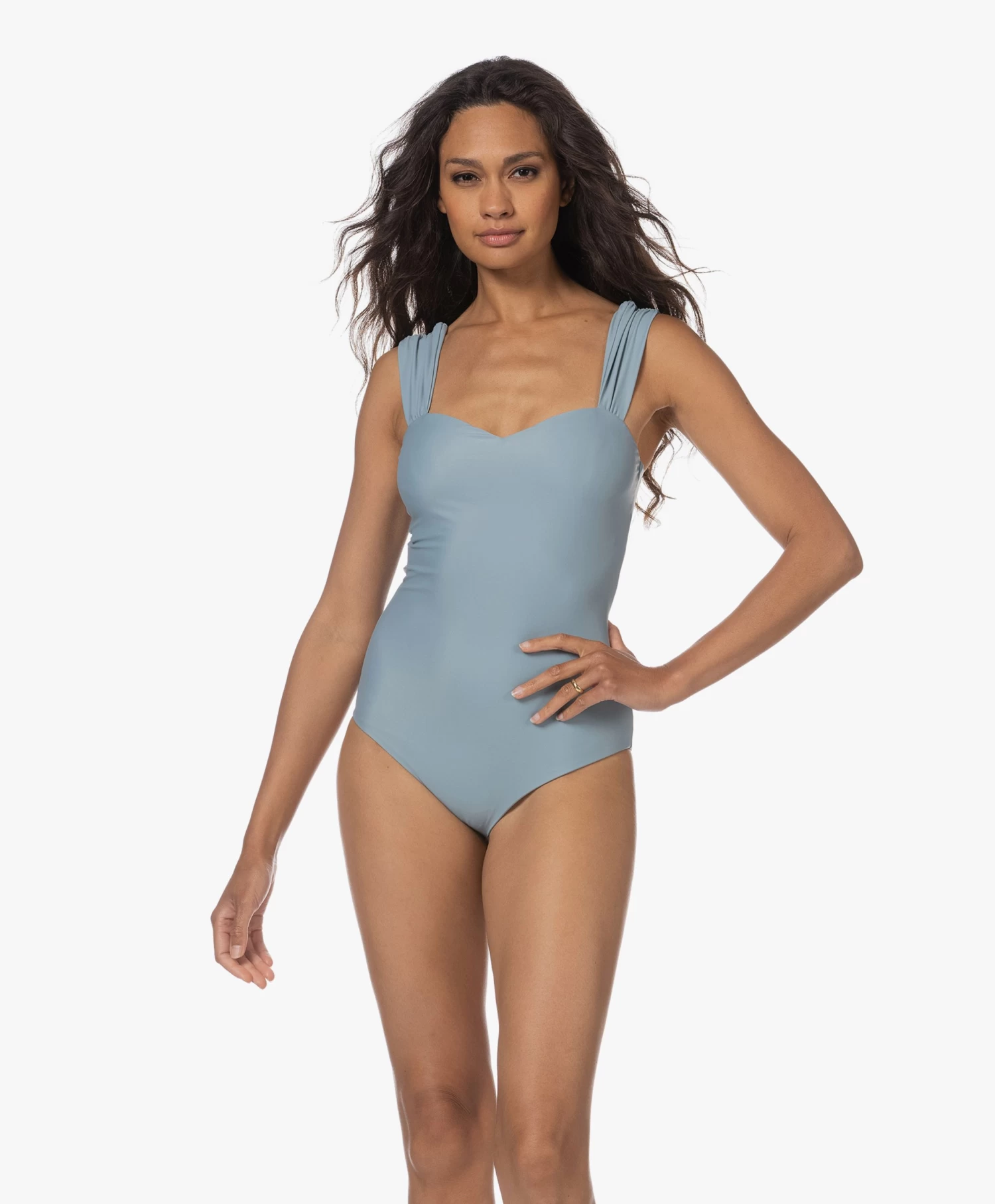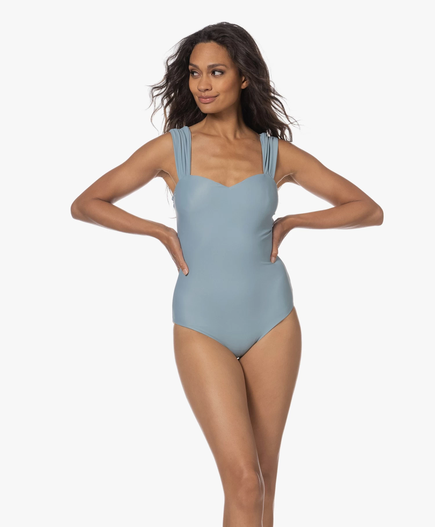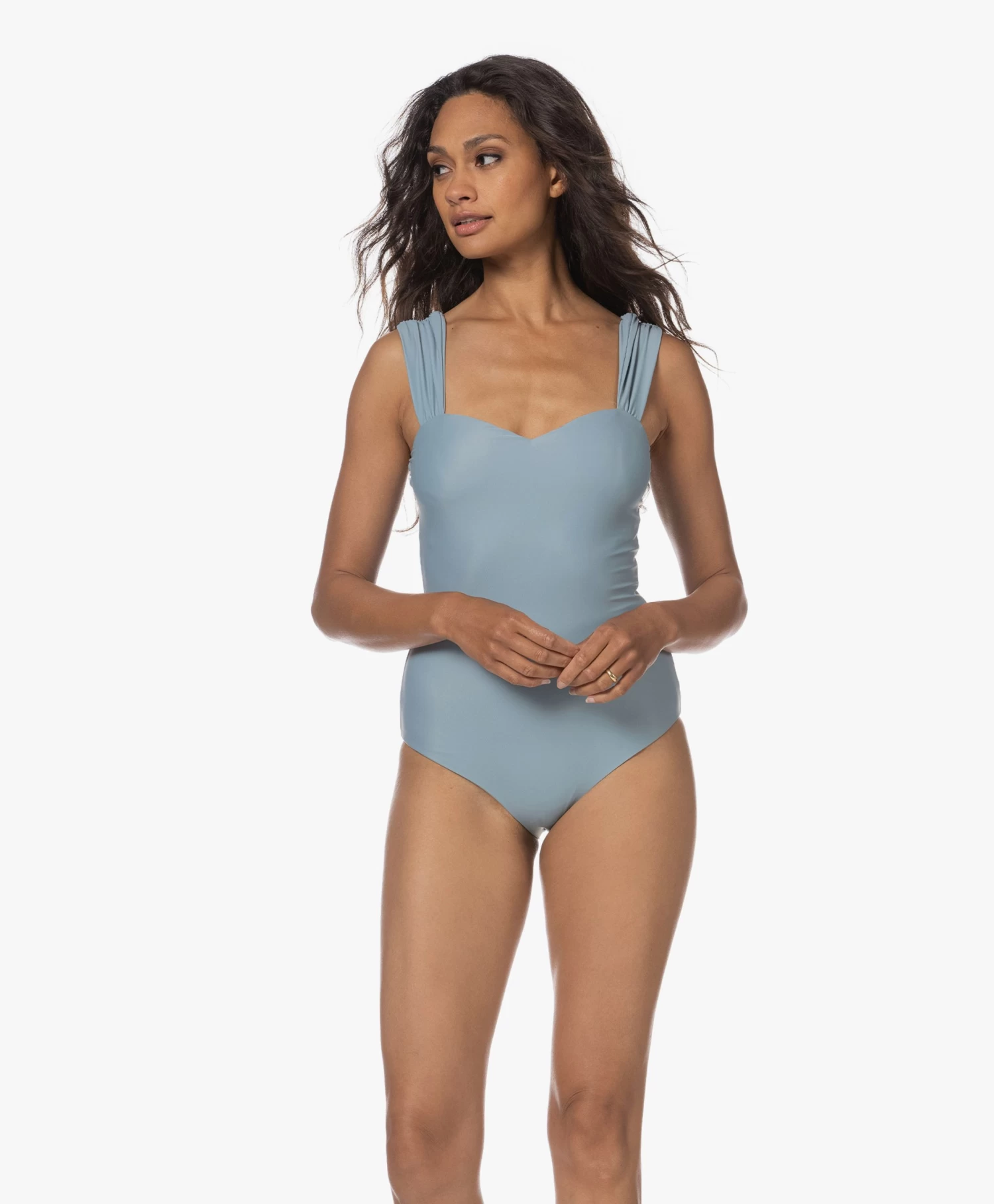 Zoals alles binnen de collectie van VIVEH, is ook het vergrijsd blauwe Cinn badpak ontworpen om je curves te omarmen – in dit geval vrij letterlijk. Het ontwerp met ‘sweatheart’ halslijn en ingebouwde cups geeft je een klassiek en bovenal tijdloos silhouet. De extra-brede, verstelbare schouderbandjes zijn niet alleen een bepalend onderdeel voor de stijlvolle look, ze zorgen ook voor voldoende ondersteuning.