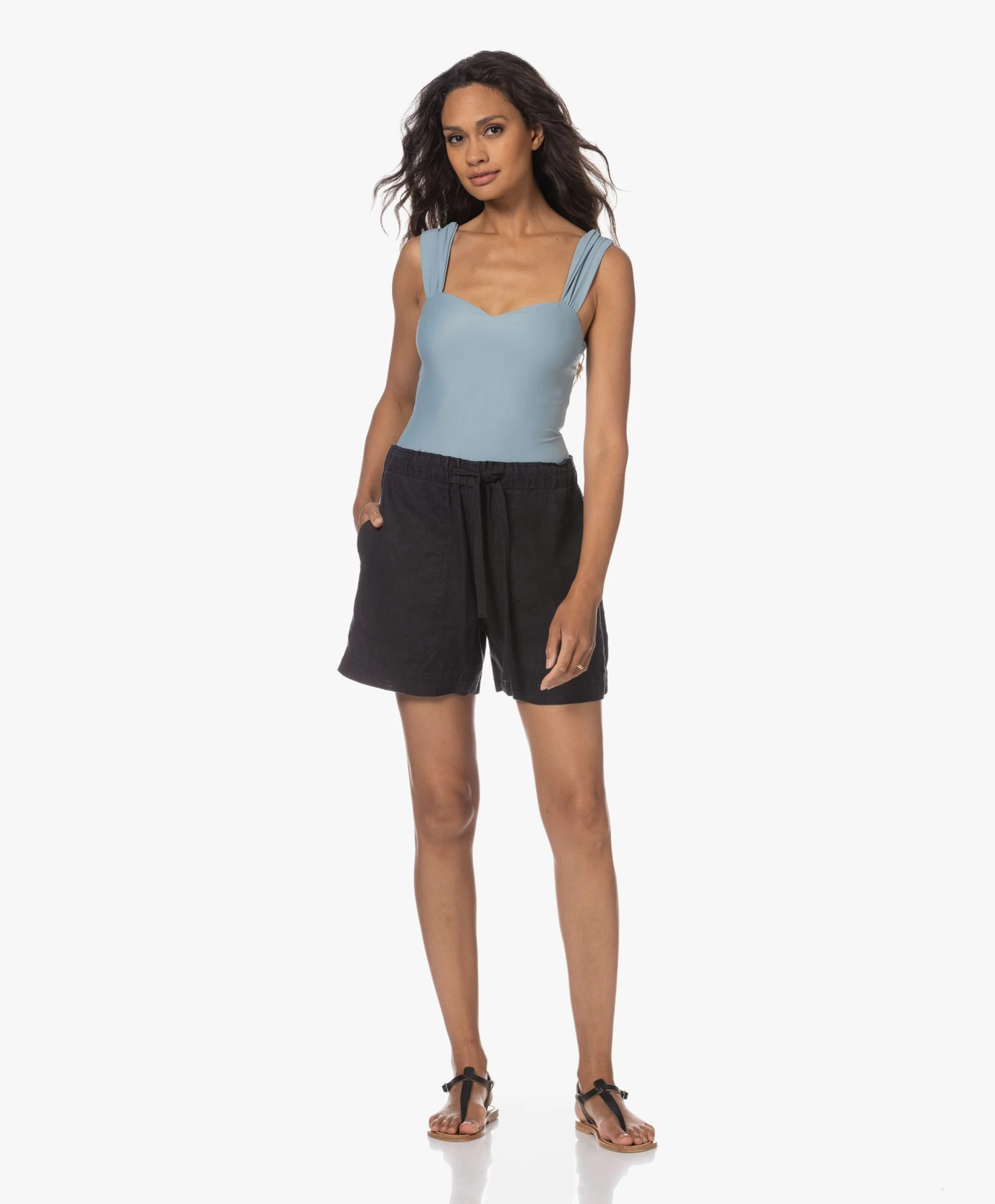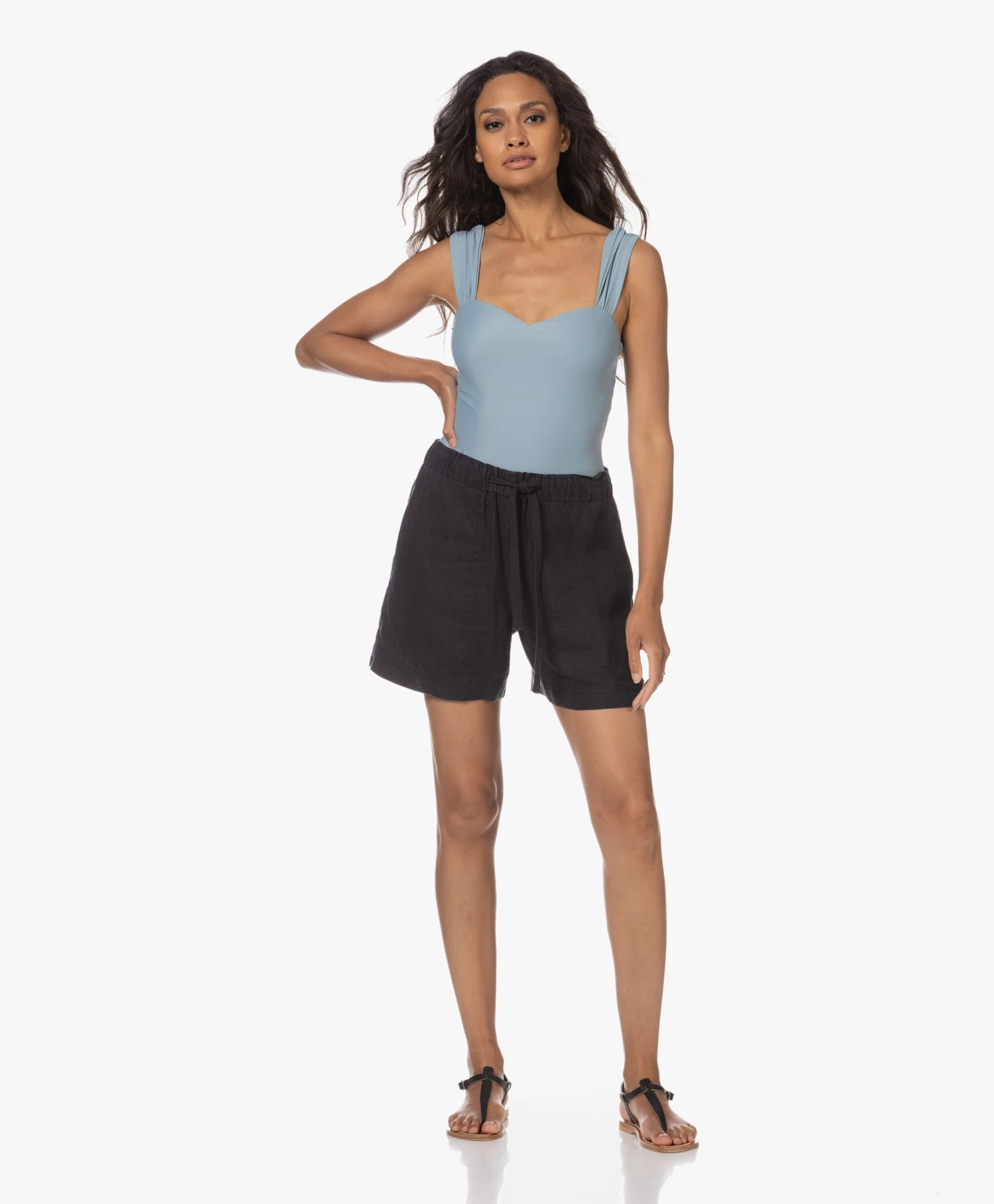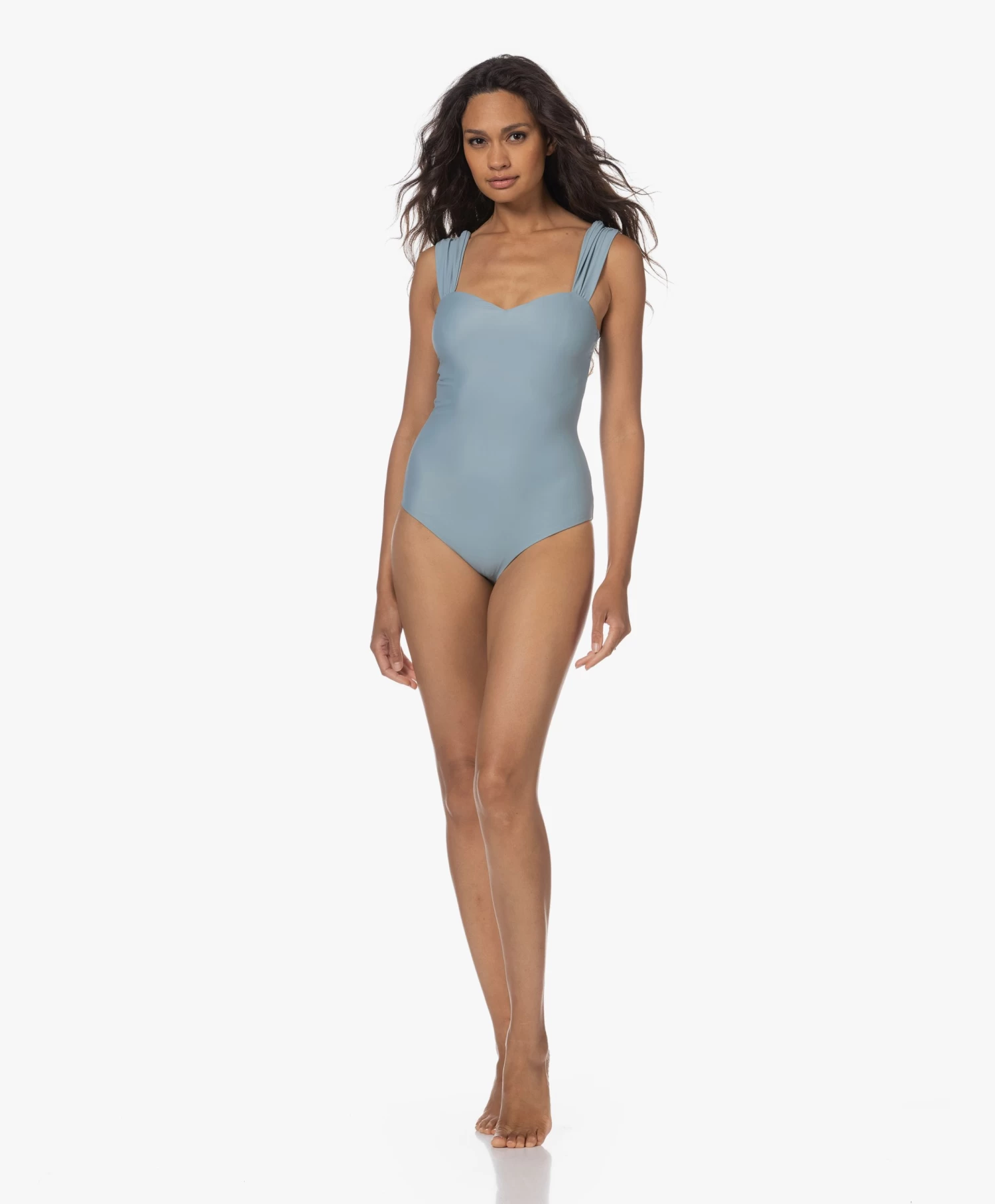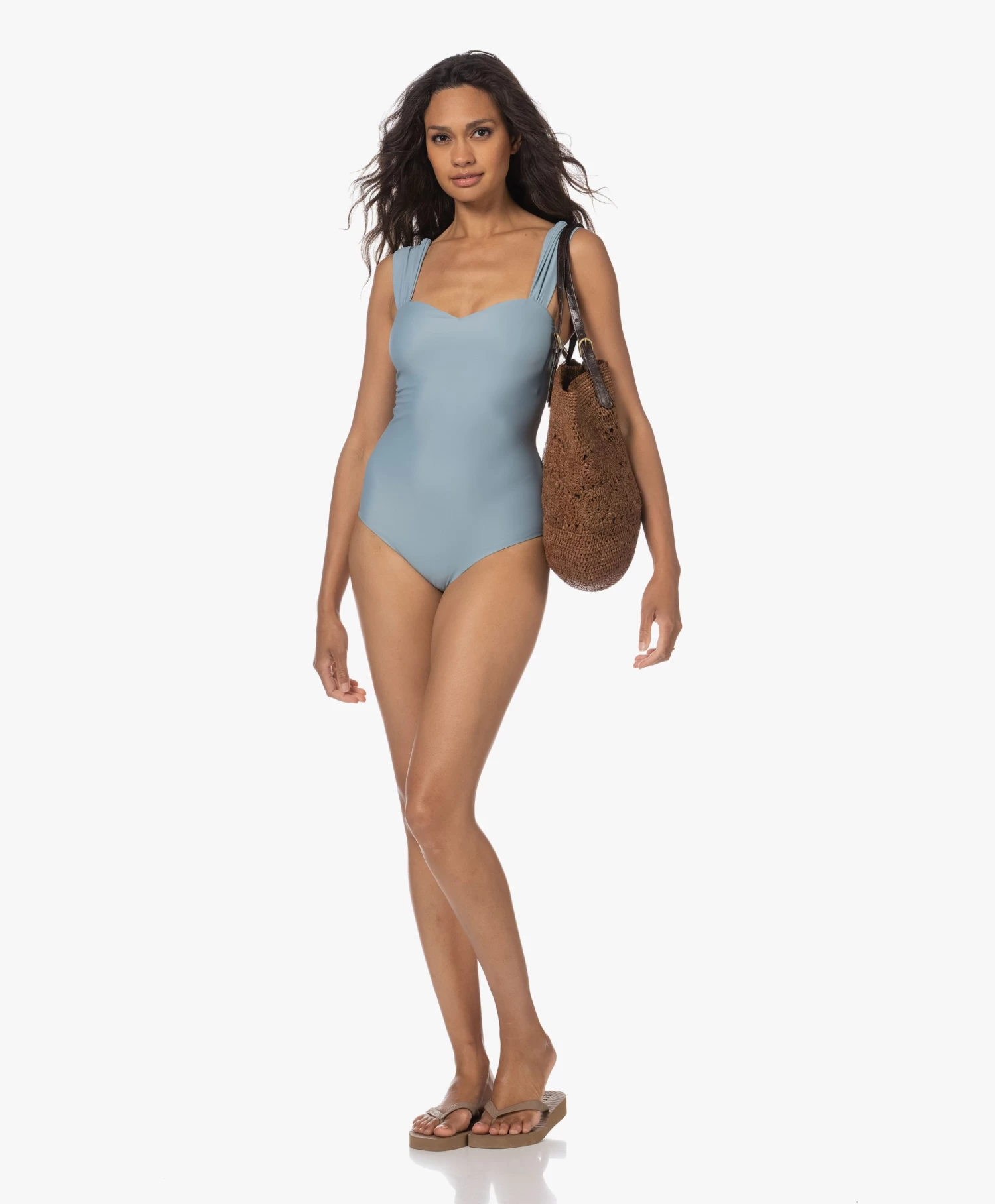 Zoals alles binnen de collectie van VIVEH, is ook het vergrijsd blauwe Cinn badpak ontworpen om je curves te omarmen – in dit geval vrij letterlijk. Het ontwerp met ‘sweatheart’ halslijn en ingebouwde cups geeft je een klassiek en bovenal tijdloos silhouet. De extra-brede, verstelbare schouderbandjes zijn niet alleen een bepalend onderdeel voor de stijlvolle look, ze zorgen ook voor voldoende ondersteuning.