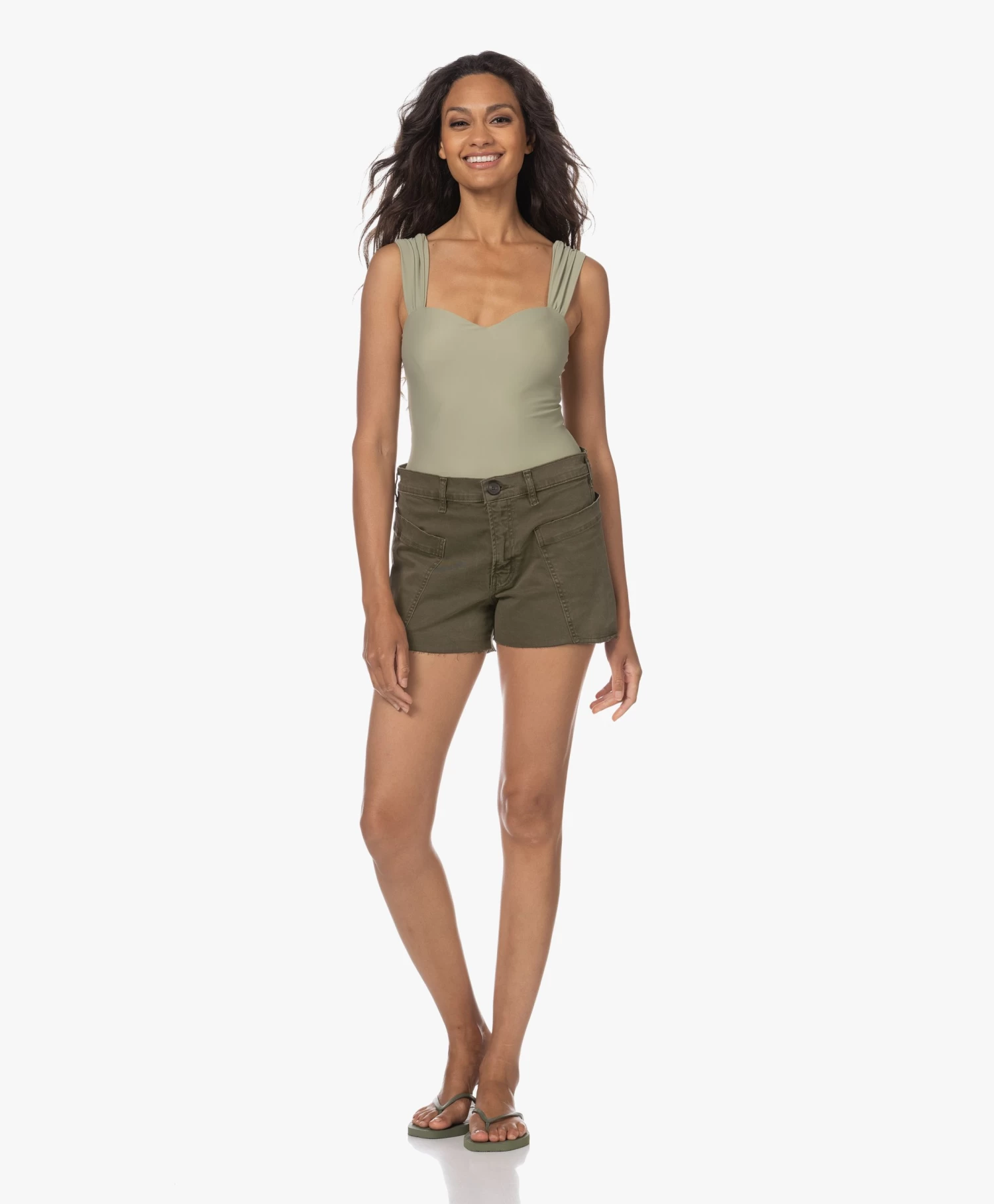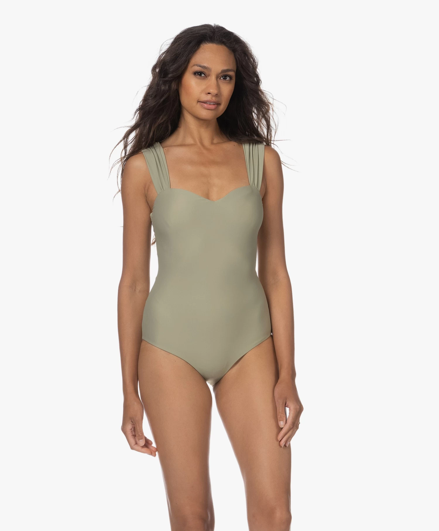 Zoals alles binnen de collectie van VIVEH, is ook het lindegroene Cinn badpak ontworpen om je curves te omarmen – in dit geval vrij letterlijk. Het ontwerp met ‘sweatheart’ halslijn en ingebouwde cups geeft je een klassiek en bovenal tijdloos silhouet. De extra-brede, verstelbare schouderbandjes zijn niet alleen een bepalend onderdeel voor de stijlvolle look, ze zorgen ook voor voldoende ondersteuning.