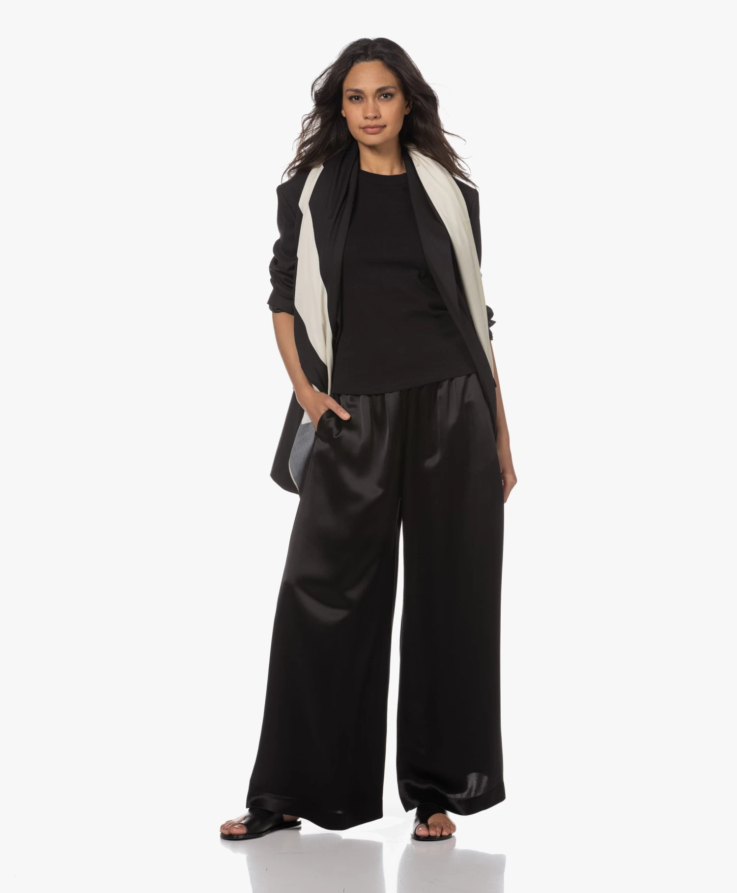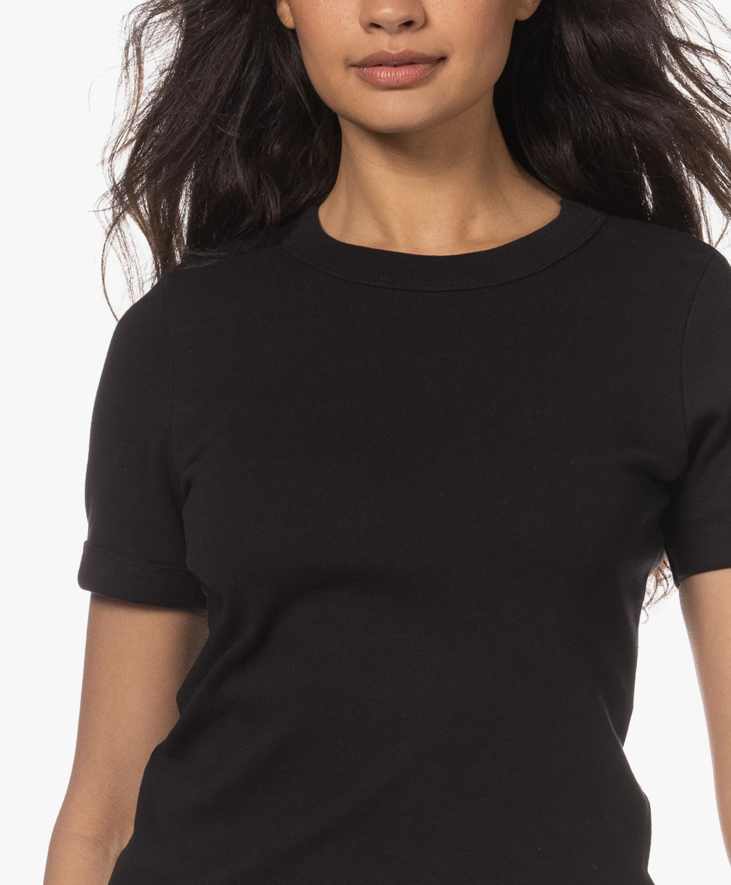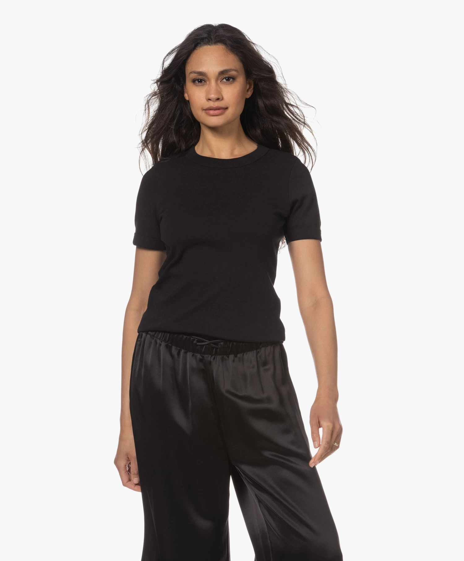 Vers uit de goednieuwe eerste collectie van VIVEH: het zwarte biologisch katoenen Esme T-shirt. Gemaakt van een zware kwaliteit interlock jersey die je contouren subtiel gladstrijkt, voorzien van brede dubbellaagse boorden die de ronde hals en mouwzoom perfect op hun plek én in vorm houden. Een fijne basis voor je dagelijkse looks!