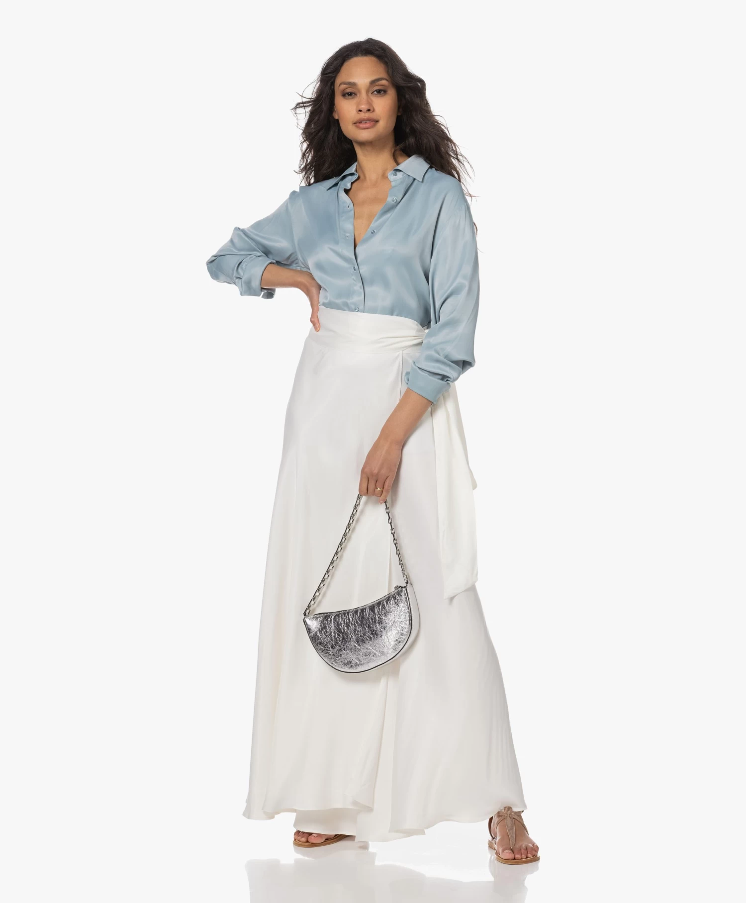 VIVEH verdient een applausje voor off-white maxi-rok Mica. Ontworpen in de stijl van een wikkelrok is dit topstuk in één moeite door ook als halterjurk te stylen! Gemaakt van glanzende, soepelvallende satijn met duurzame Ecovero viscose. Goed om te weten: dankzij de wikkelconstructie is het pasbereik ruim.