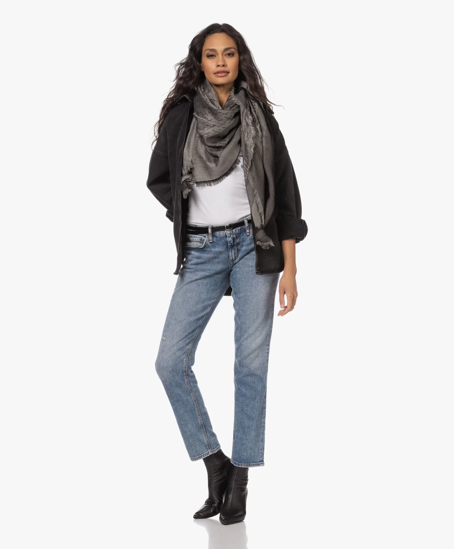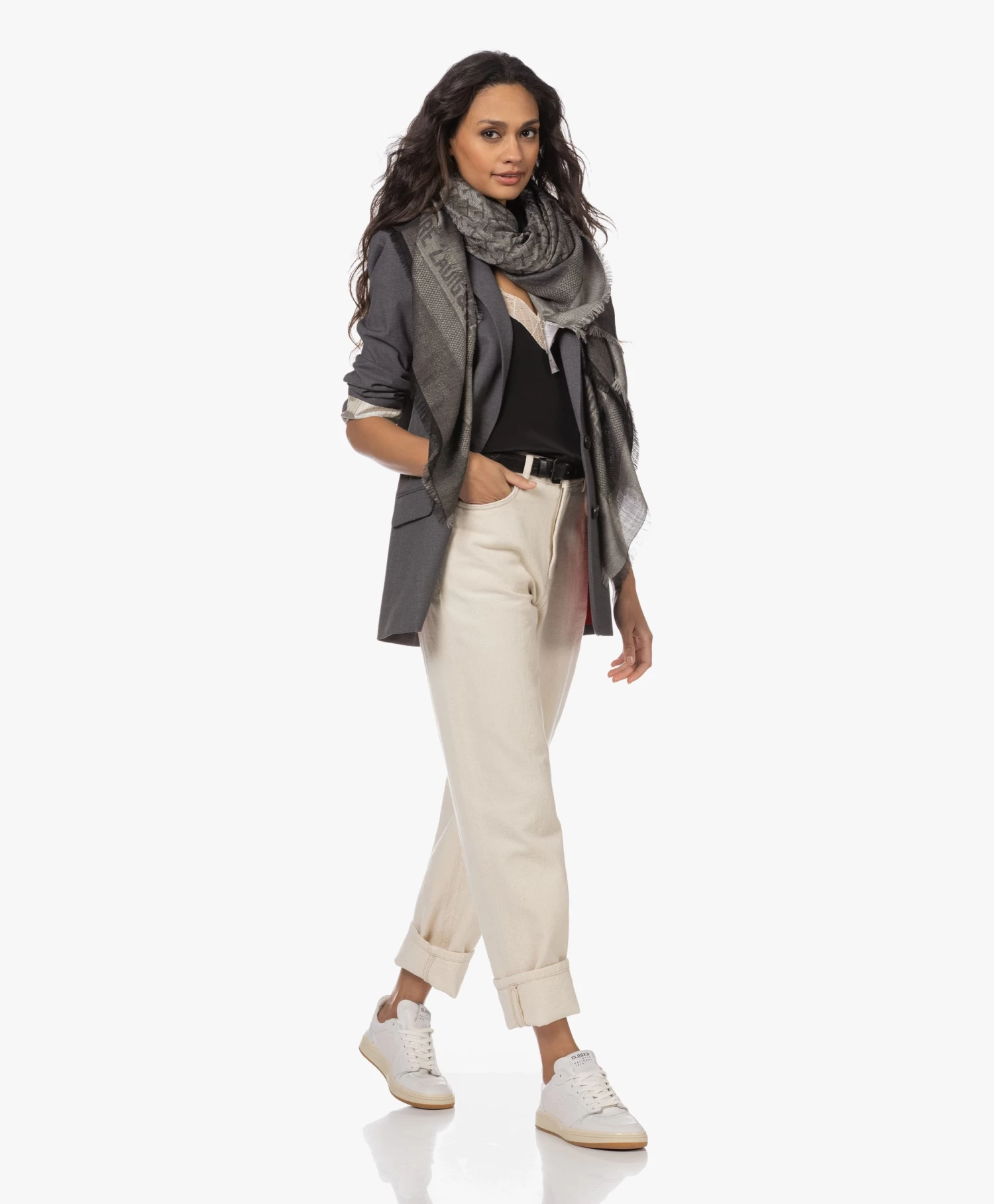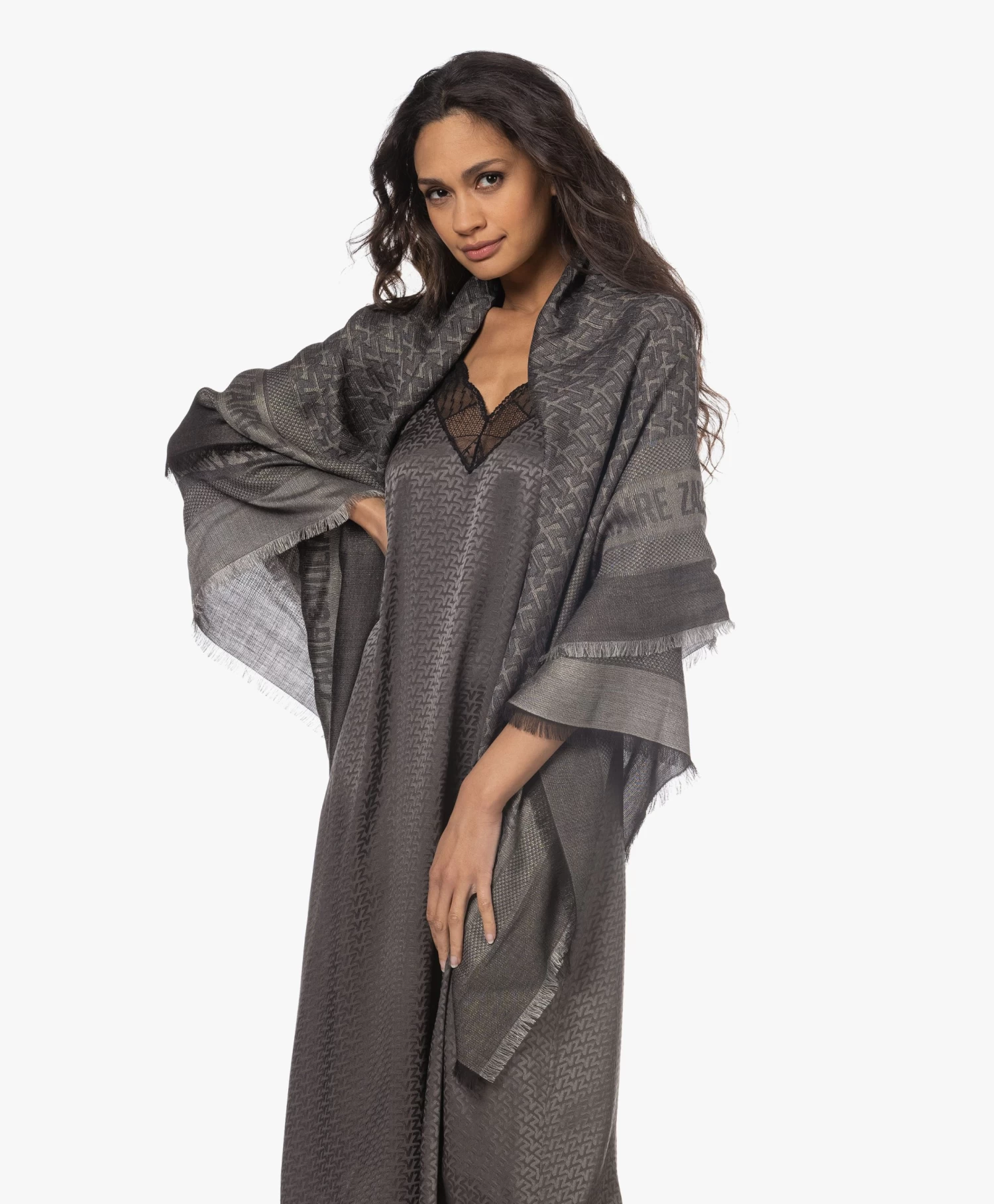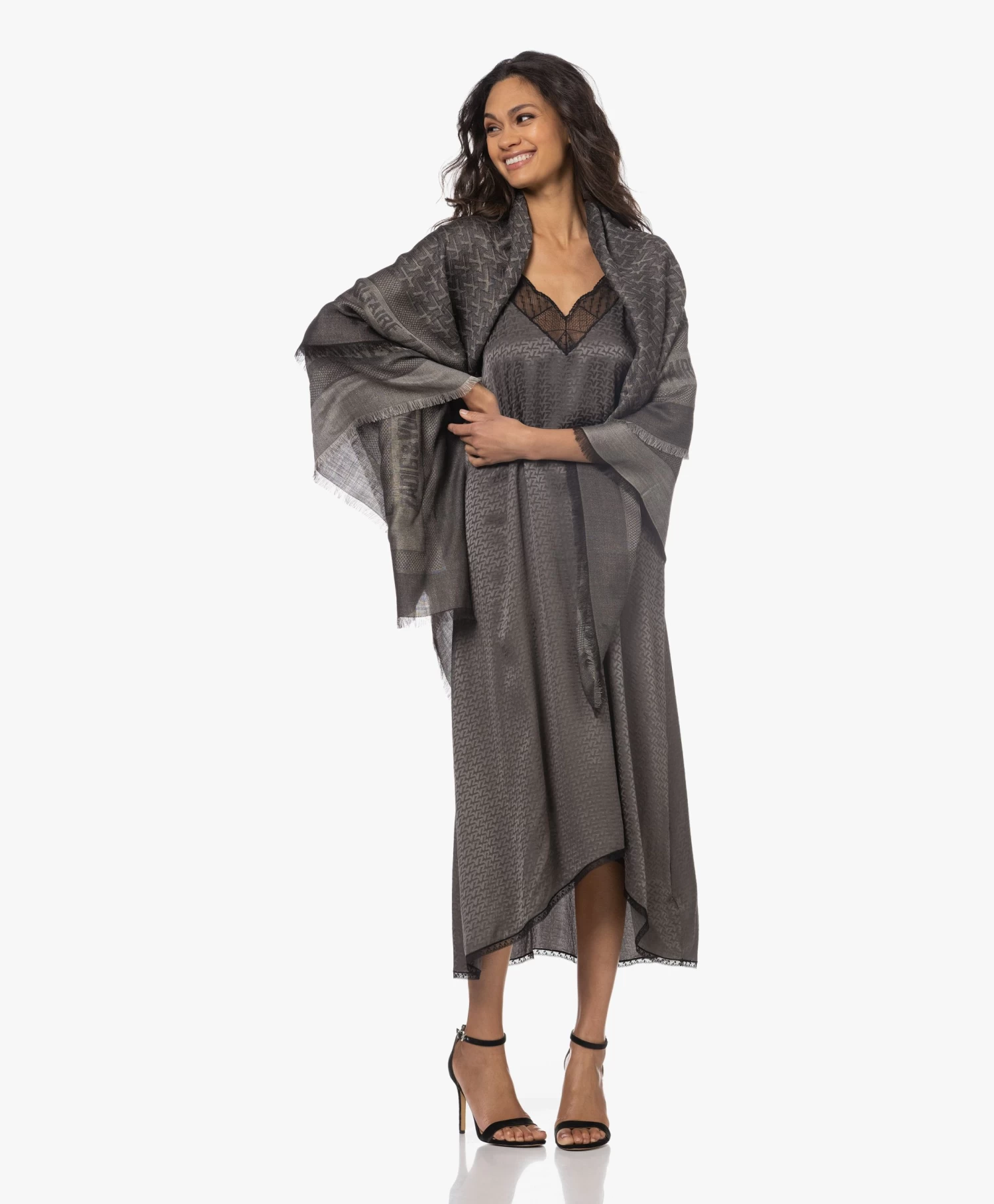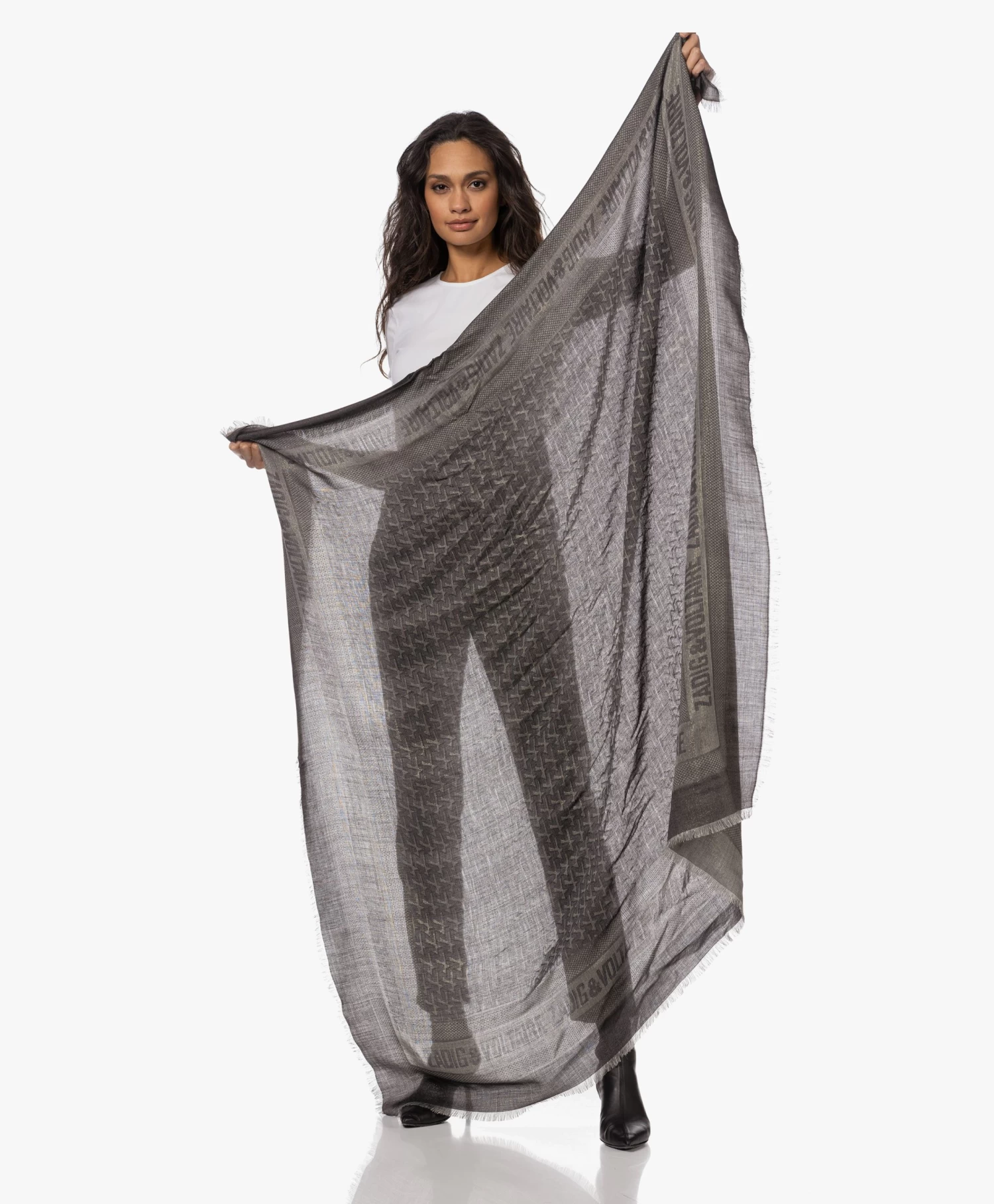 Opvallende branding, een vleugje glam én toch tijdloos: dit is Zadig & Voltaire op z’n best. Sjaal Glenn is voorzien van een all-over jacquard ZV-logoprint en verfijnde franjes langs de zijdes. De sjaal is gemaakt van een fijn geweven kwaliteit van een modal-viscosemix met een vleugje wol waarin zilverkleurige lurex garens zijn verweven voor een glinsterend effect.