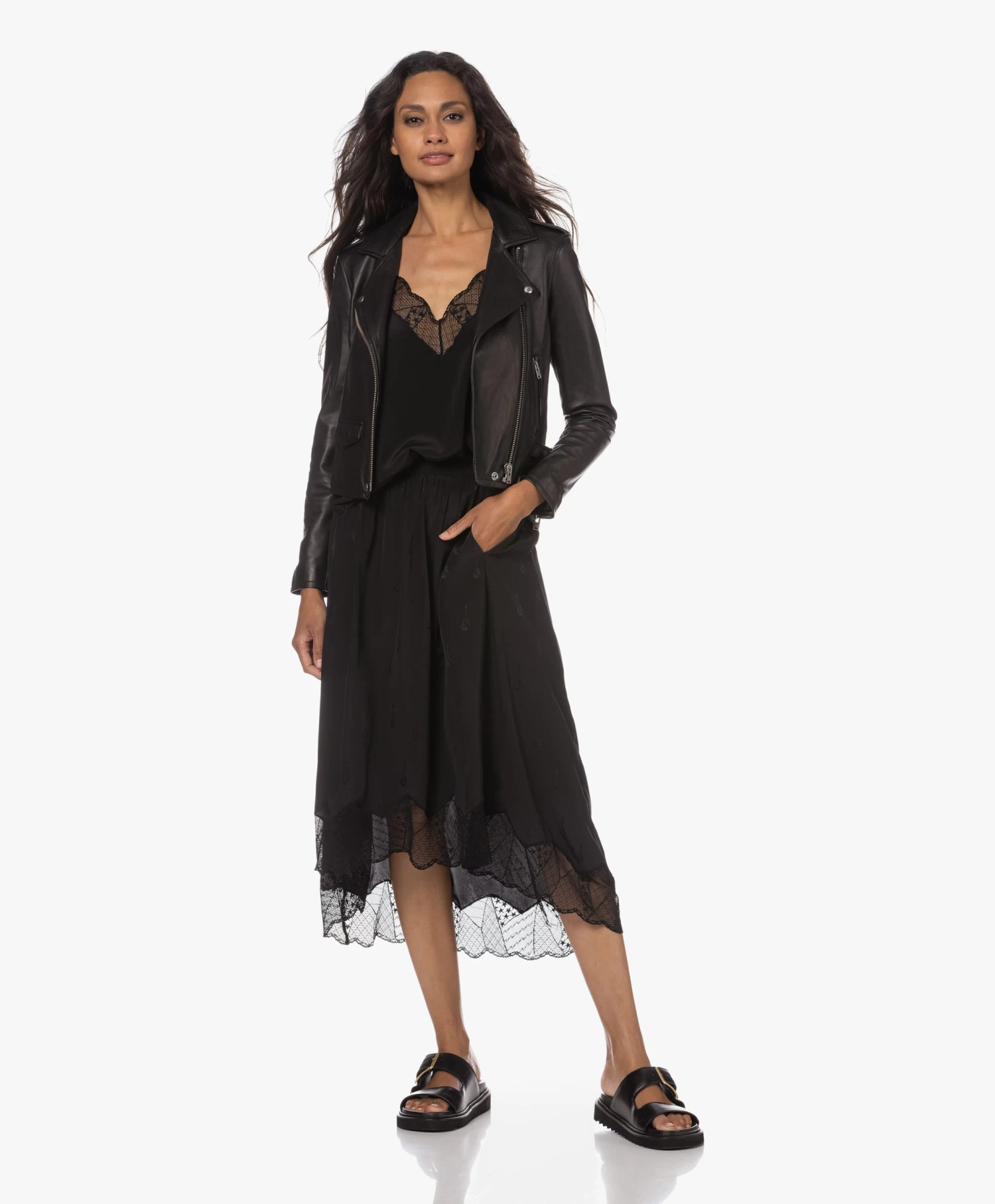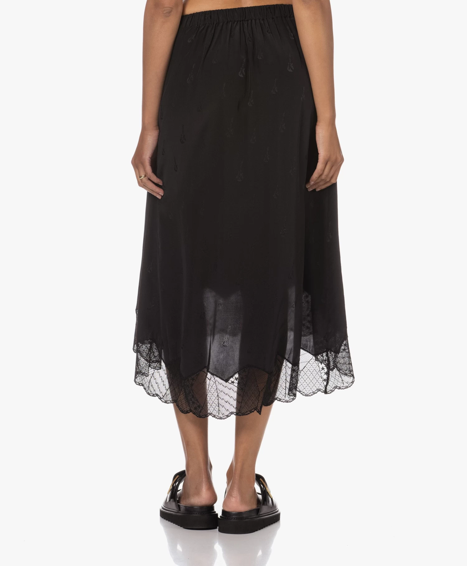 Dit seizoen kun je niet zonder bohemien-geïnspireerde stijlen – denk aan breezy jurken en tops en deze zijden rok van Zadig & Voltaire. De zwarte midi-rok heeft een soepel vallend A-lijn silhouet en een trendy afgeronde zoom met kant afgewerkt. De unieke ton-sur-ton gitaarprint zorgt voor een coole touch.