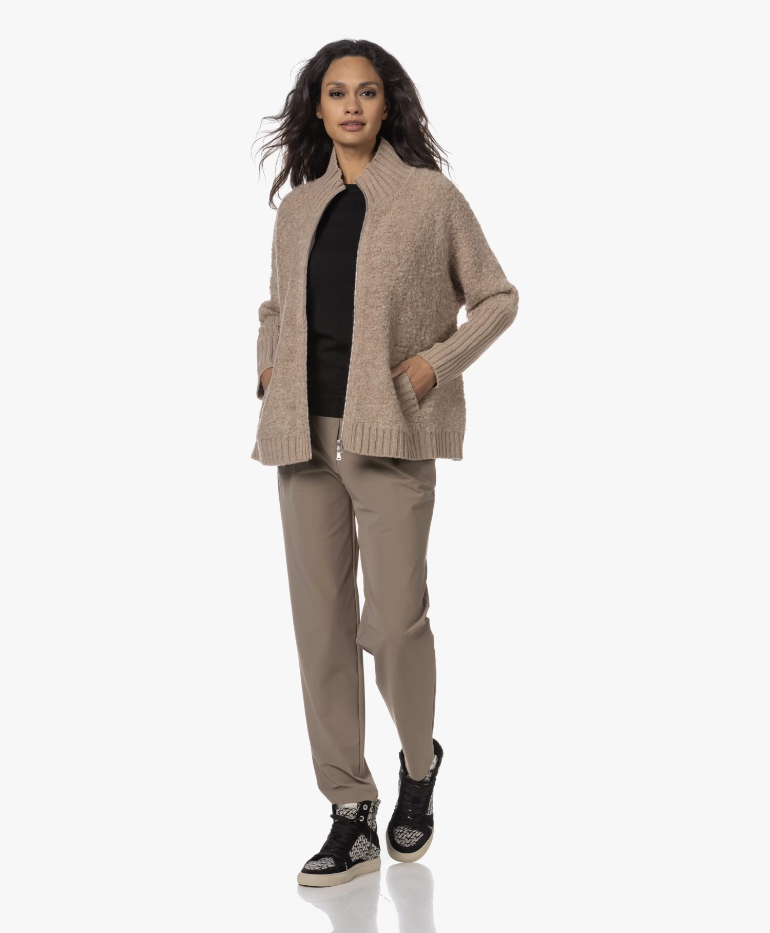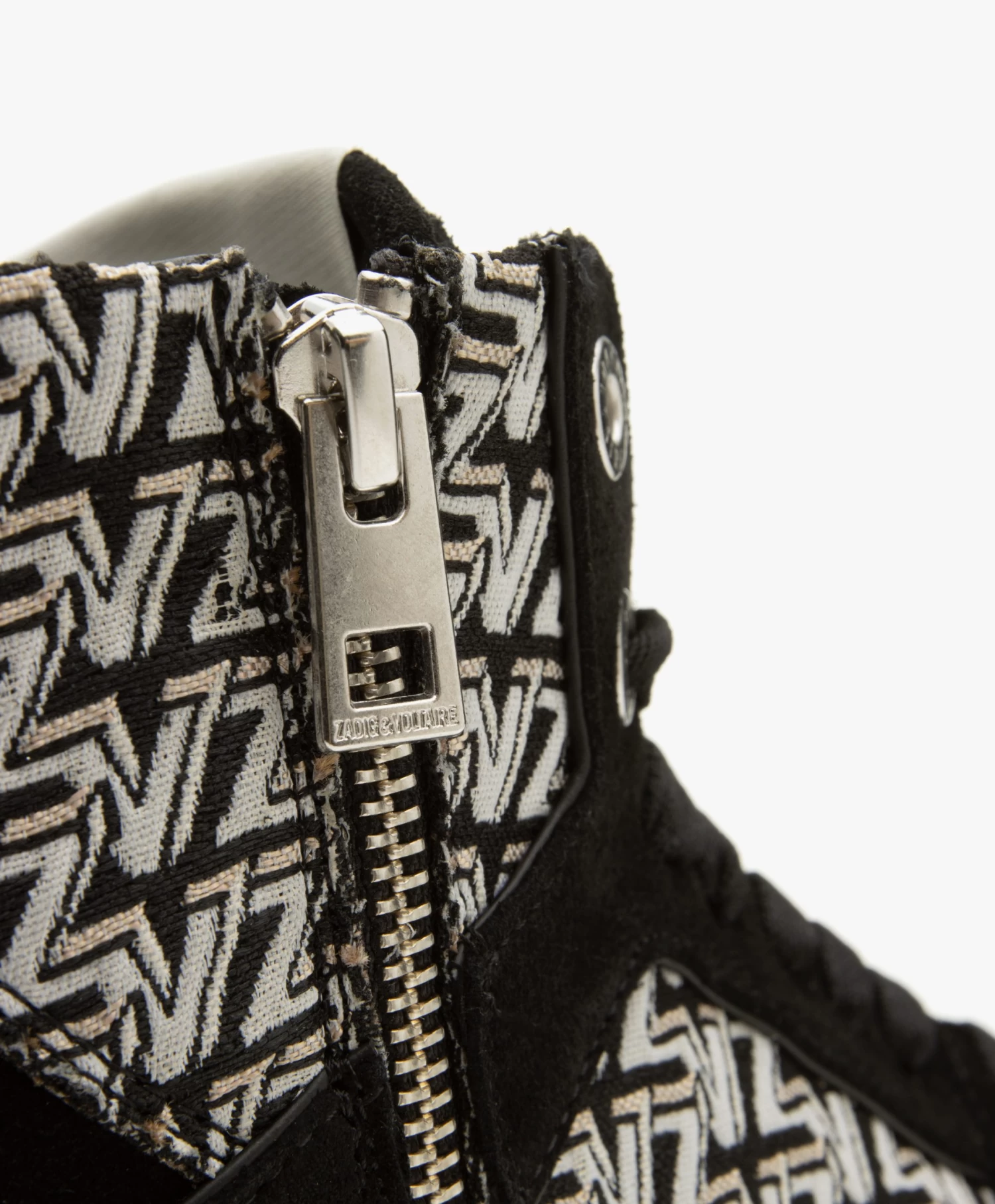 Deze high-top sneakers van Zadig & Voltaire tonen een all-over ZV-print in zwart, off-white en lichtgrijs en vertegenwoordigen daarmee op stijlvolle wijze de merkidentiteit. De zwarte suède details zijn een cool contrast. De sneakers zijn ontworpen met een iconisch bliksemdetail middenachter, een zilverkleurige rits en een wit label op de tong. Draag dit comfy-coole paar met alles – van een breezy jurk tot een T-shirt-en-denim combinatie.
